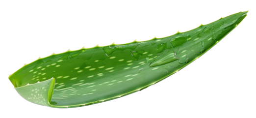 Fresh aloe vera leaf with water droplets on transparent background - stock png.