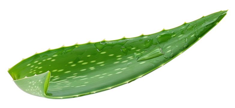 Fresh green aloe vera leaf cut open with clear gel dripping, cut out, stock png, isolated on transparent background