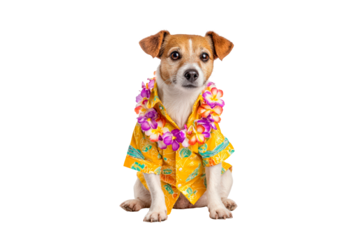 Cute dog in hawaiian shirt with floral necklace on transparent background, PNG