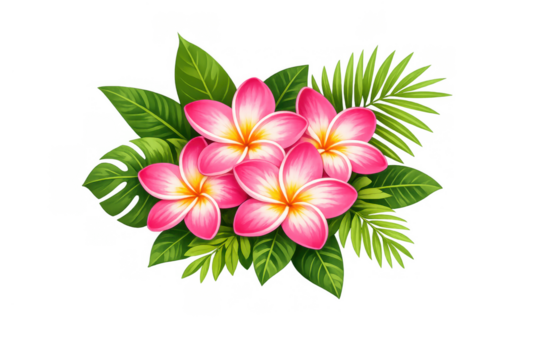 Pink frangipani plumeria flowers bouquet with tropical green leaves, botanical arrangement on transparent background
