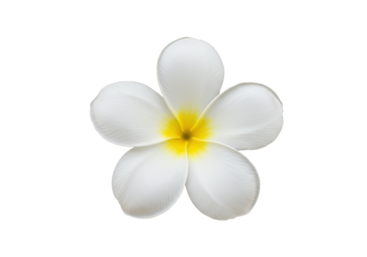 A single frangipani flower with white petals and a yellow center, isolated on white background