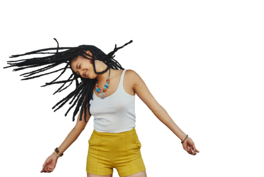 Smile, dancing and woman with dreadlocks hair isolated on a transparent png background. Happy, freedom and African person with braids, energy for moving to rhythm of music and celebration of party