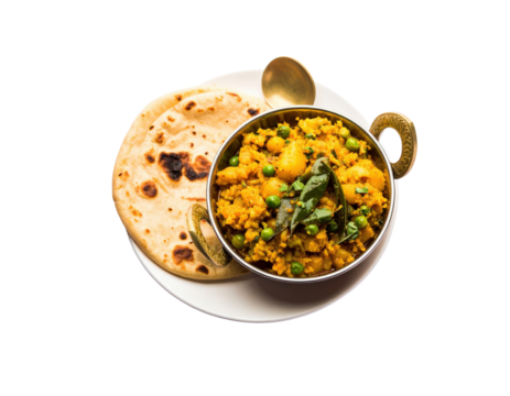 Aloo Matar Sabzi a spicy Indian potato and pea curry served in a brass kadai with fresh roti.