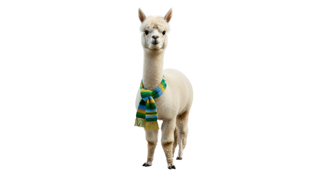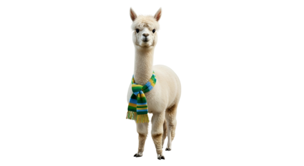 Cute white alpaca wearing a colorful scarf standing on a white background.