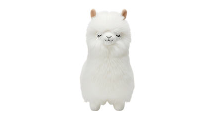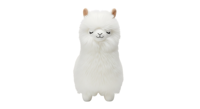 Charming fluffy alpaca plush toy standing proudly against a bright white background isolated on transparent background