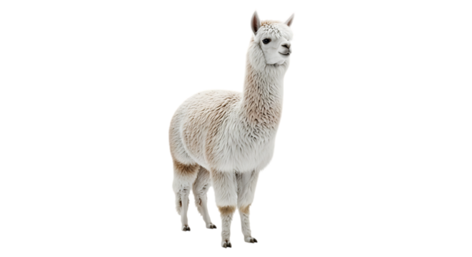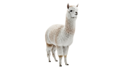Adorable fluffy white alpaca standing gracefully isolated on a transparent background showcasing its gentle and calm nature