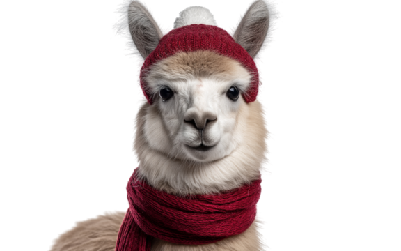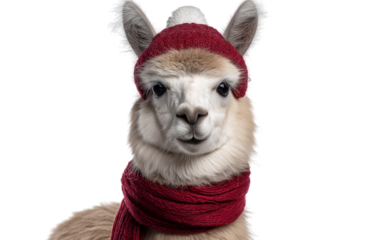 Cute alpaca wearing red hat and scarf isolated on a transparent background