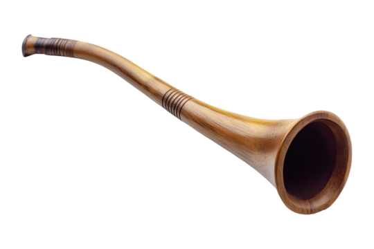 Traditional alphorn isolated on transparent background, a long wooden horn used in the swiss alps, known for its deep and resonant sound