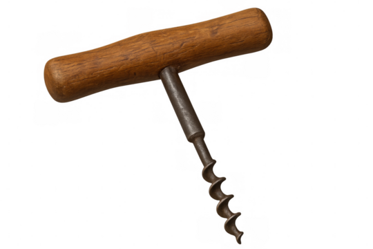 Antique corkscrew with wooden handle isolated on transparent background, perfect for vintage or wine-related designs