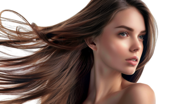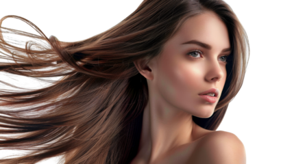 Beautiful model with long brown hair flowing in the wind on transparent background