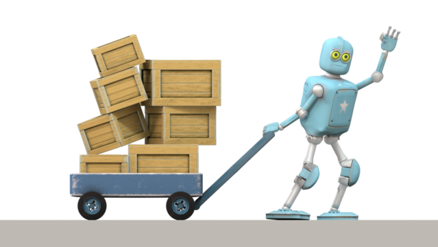 Retro robot moving cart with boxes, 3D video render cartoon style, on orange background, alpha channel
