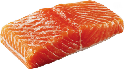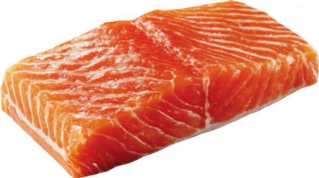 A fresh, raw salmon fillet with visible white fat lines, isolated on a transparent background