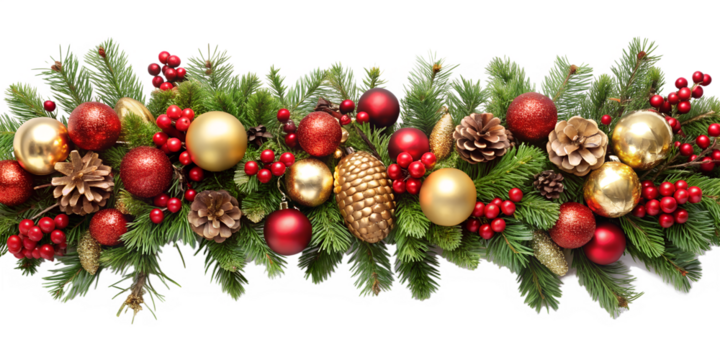 A festive christmas garland with pine branches, red and gold ornaments, berries, and pine cones creates a traditional holiday decoration isolated on transparent background