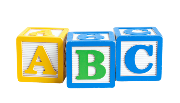 Colorful red blue green wooden blocks with letters a, b, c toy isolated on transparent background