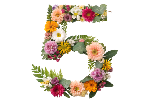 Number 5 made of real natural flowers and leaves crafted with pure elegance