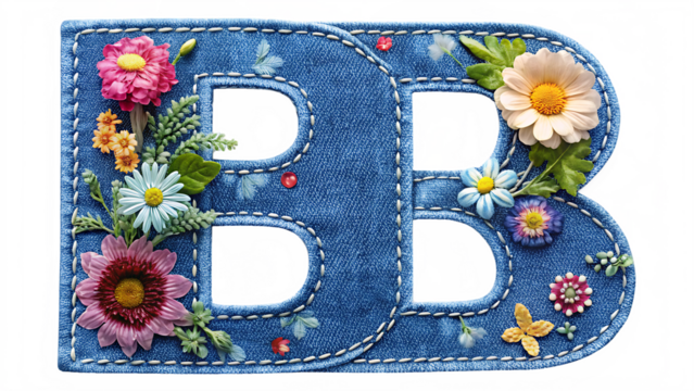 denim letter B with gentle flowers on with white background PNG
