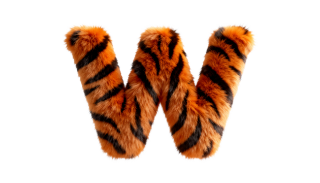 3D Render of a Tiger Fur Letter W Alphabet with Copy Space, Perfect for Modern Designs and Animal-Themed Projects, High-Quality Transparent PNG Background