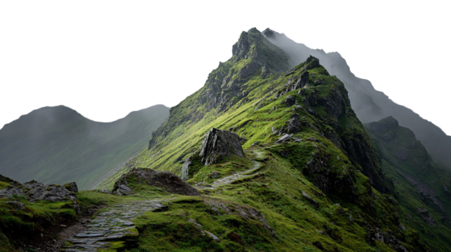 Jagged mountain peaks with sunlit green slopes and a winding path isolated on a transparent background