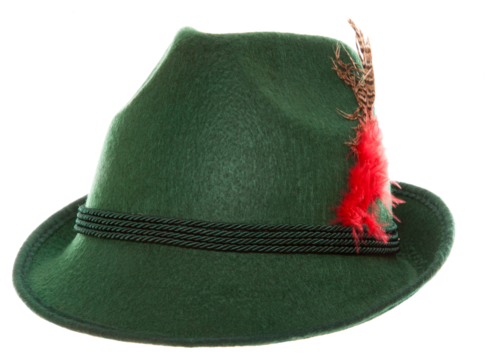 A traditional green Bavarian alpine hat adorned with decorative feathers, isolated on a transparent background, showcasing classic German folk attire, festive culture, and regional craftsmanship.
