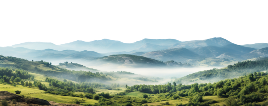 Picturesque mountains with sun rising behind peaks, isolated on transparent cutout background