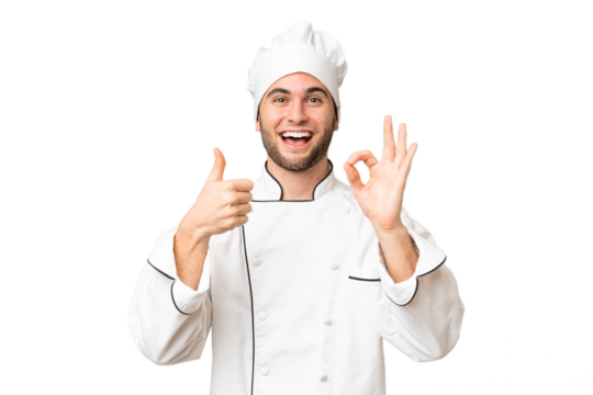 Young handsome chef man over isolated background showing ok sign and thumb up gesture