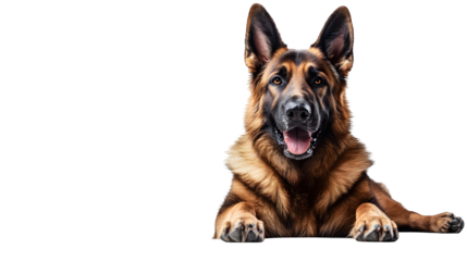 Happy joyful German Shepherd dog lying on the floor, pet isolated on transparent background, animal smile with tongue out