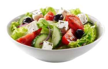Bowl of vibrant Greek salad.  Fresh ingredients,  including lettuce,  tomatoes,  cucumber,  and feta cheese.  Dark olives are also present