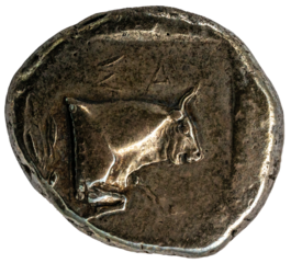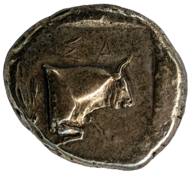 antike griechische Münze aus Samos, Vorderteil eines Stiers im Profil