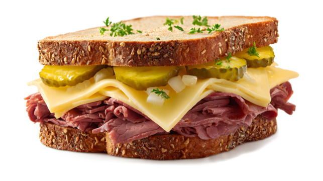 alt Beef or Pastrami With Gherkins and cheese sandwich isolated on a white background