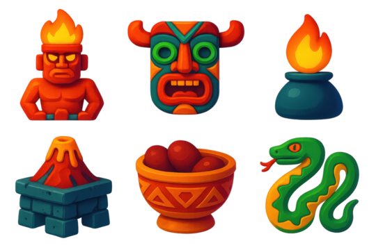 Volcanic Mythology Icons. 3D icon set of volcanic mythology: fire god idol, ritual mask, sacred flame, stone altar, offering bowl,