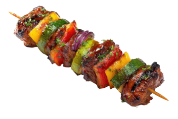 Single grilled kebab skewer with alternating vegetables and meat pieces, rich char marks and glossy roasted highlights, detailed textures and appetizing color contrast, isolated on transparent backgro
