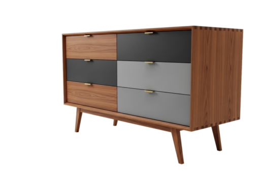 A sophisticated mid-century modern walnut wood credenza with four drawers in alternating muted grey and natural textures, isolated on a transparent background, functional minimalism concept