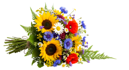 Beautiful bouquet of sunflowers, cornflowers, poppies, and daisies isolated on transparent background, perfect for summer celebrations and rustic weddings