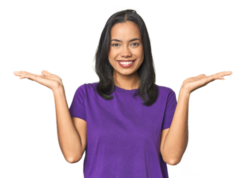 Young Latina posing in studio makes scale with arms, feels happy and confident.
