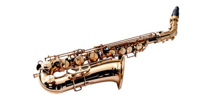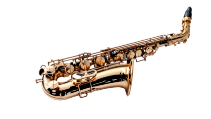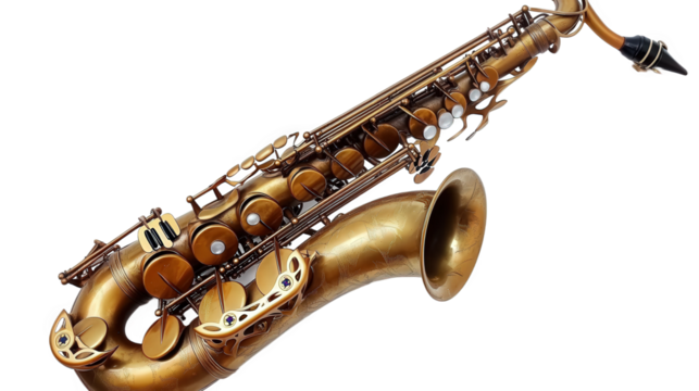 Tenor saxophone with elegant curves, detailed keys and mouthpiece, isolated on transparent background png.