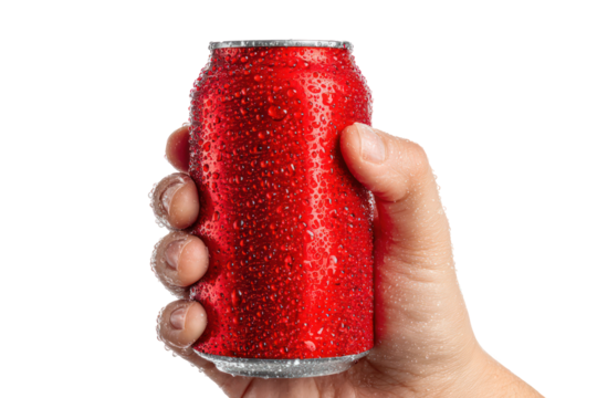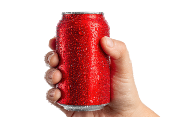 Hand holding a classic red soda can with condensation on transparent background