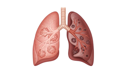 Anatomical illustration of human lungs showing healthy tissue and tumors isolated on a transparent background