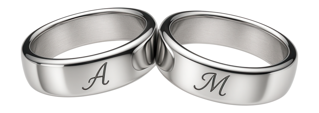 Sterling silver couple rings with engraved initials and a sleek finish