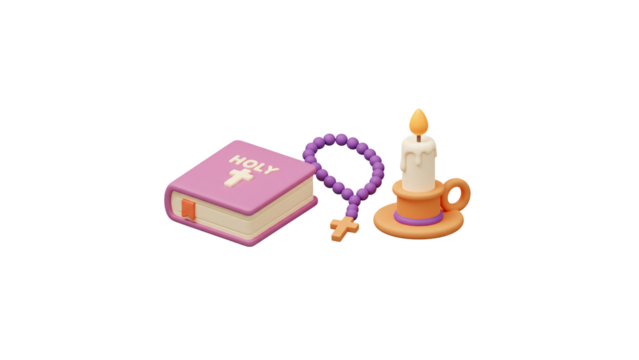 Religious items including bible, rosary, and candle for prayer and faith based worship services on transparent background