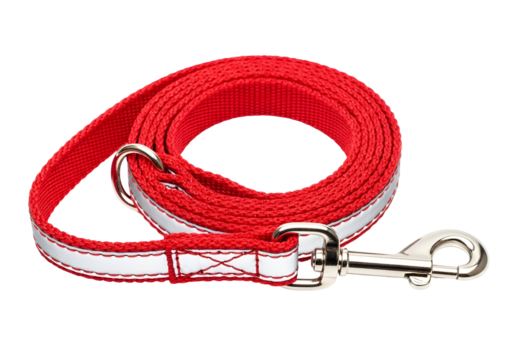 A coiled red dog leash with reflective white stripes and a metal clasp is presented against a black backdrop.