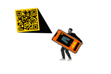 Composite photo collage of astonished american guy hold big iphone projection light qr code technology isolated on painted background