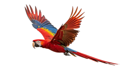 Blue and Gold Macaw in Flight: A vibrant blue and gold macaw spreads its wings in mid-flight, its feathers shimmering with a brilliant palette of colors against a clean, white background.