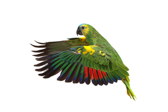Beautiful flying Blue Fronted Amazon parrot isolated on transparent background png file