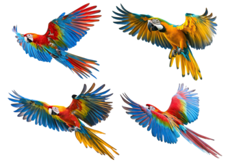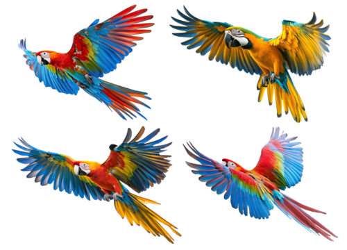 Set of colorful parrots flying with wide-spread wings, isolated on transparent cutout background