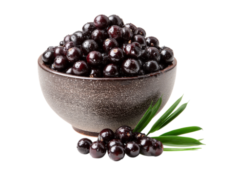 Fresh acai berries in a bowl with green leaves, Isolated On Transparent Background