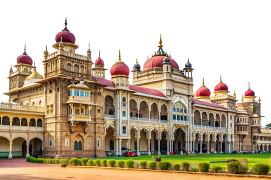 Mysore Palace, grand Indo-Saracenic royal residence with red domes and manicured lawns, cutout, PNG, isolated on white or transparent background, AI