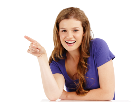 Portrait, point and announcement with a woman isolated on transparent background for marketing or advertising. Smile, information or gesture with a happy young female brand ambassador pointing on PNG