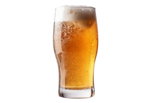 A refreshing pint of golden beer with foam, isolated on white background.
