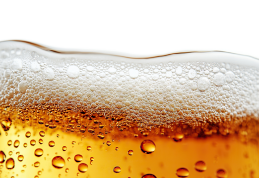 Close-up of golden beer with foam and bubbles, isolated on transparent cutout background