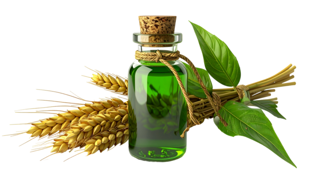 A glass bottle with green liquid, wheat, and green leaves on a black bg